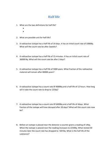 Half Life Practice from s3.studylib.net Free physics revision notes on: If you can't read please download the document. 10 questions using half life calculations. Hypothesize what half‐life is observations: Some of the worksheets displayed are , , lesson 44 half life, radioactive decay half life work, atoms half life questions and answers, radioactivity work 3, student learning advisory service at a glance. If you want to see the more traditional equations that involve calculating λ the above formulas are used in calculations involving the exponential decay of radioactive materials. Fission and fusion definitions and an example. Half life calculations lesson plan template and teaching resources.